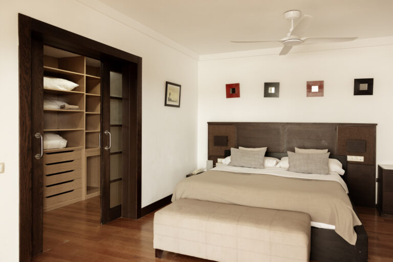 - Upper floor master suite with a walk-in wardrobe, en-suite bathroom, and a private terrace with views of the pool and nearby volcano.